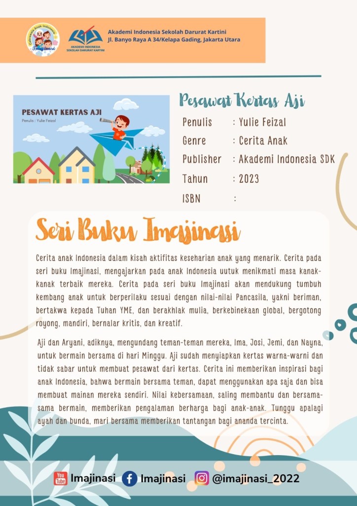 Cerita anak sebagai media belajar untuk mengembangkan stimulasi dan motorik bagi tumbuh kembang anak. Dalam buku ini adalah tentang cerita Aji bermain membuat pesawat kertas. Terdapat pesan-pesan yang positif untuk membangun karakter anak.
